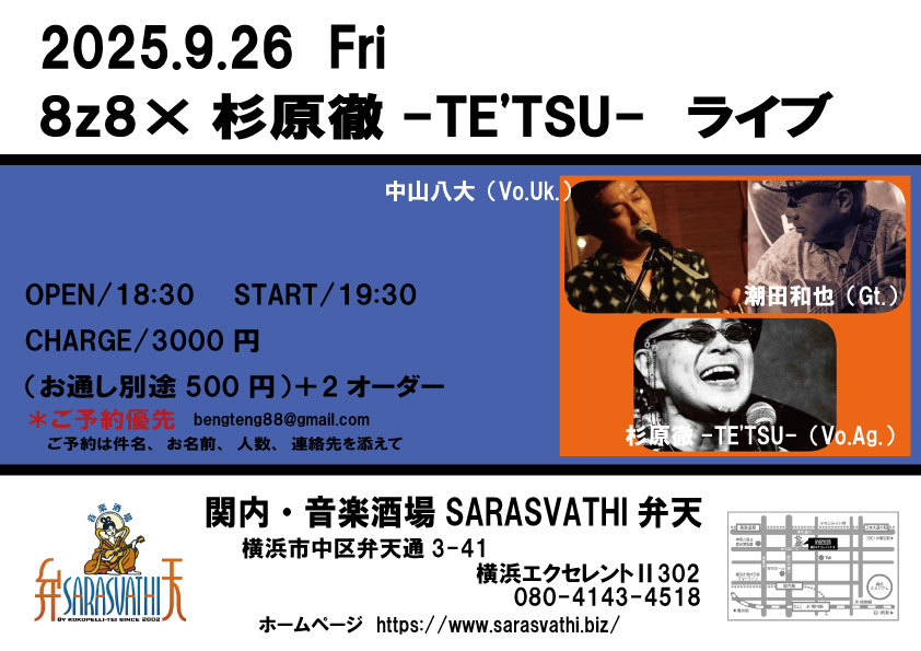 ご予約は、【ライブの日付・氏名・人数】を明記の上