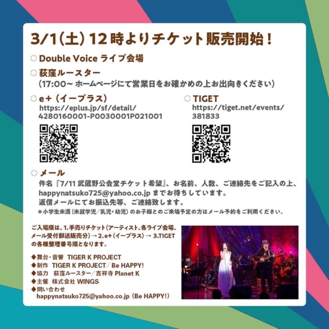 件名は『1207チケット予約』、お名前、人数、ご連絡先をご記入の上happynatsuko725@yahoo.co.jpまで。